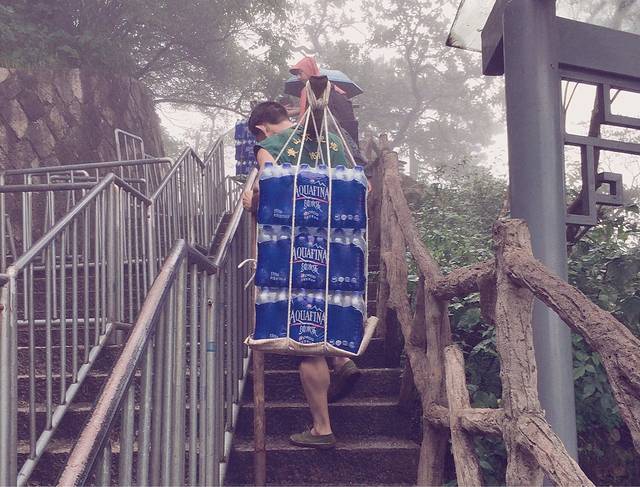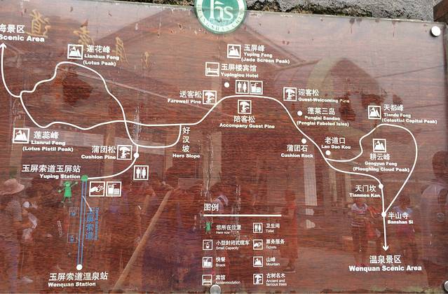 早上8点50左右,旅游大巴才离开市区,要开1个多小时才能到黄山。市区在屯溪,如果自己坐车,可以在客运总站坐班车到汤口镇。山下小店可以寄存行李,10元一件。大部分人在这购买了雨衣雨裤鞋套,15一套。登山杖5元一根,我只买了鞋套,雨衣出门时在酒店买的3元,山脚5元,山上10元,士力架10元买了一根,上山车票19元一直坐到云谷索道,索道上山票价80元。
