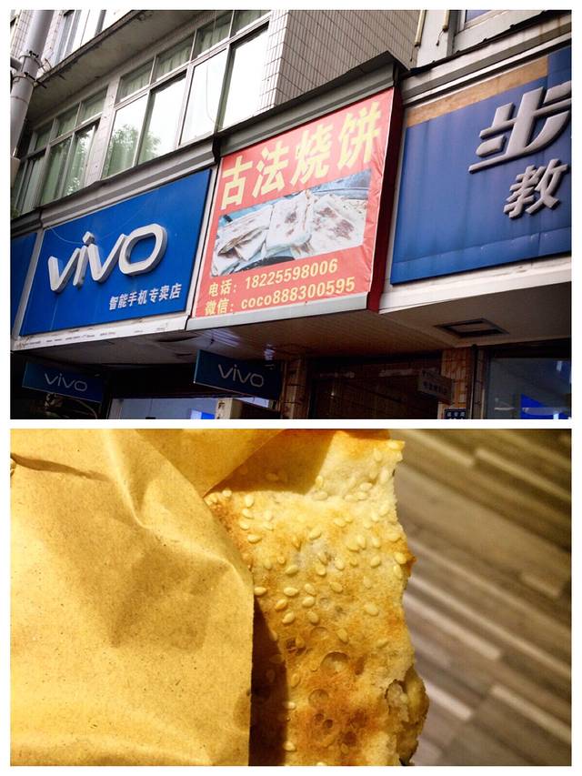 出了老街看到一家烧饼店好多人买,过马路去买了一个,向老板娘要个白色塑料袋打包,老板娘说买5个才给,助手扯了一个给我,老板娘又给我换了个板上放着的,不知道装过什么……