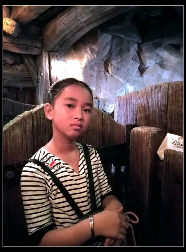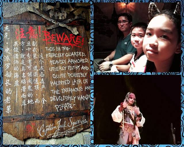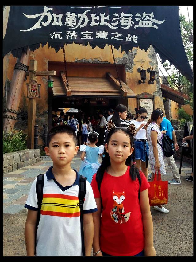 排队40分钟才取到“雷鸣山漂流”的FP,现在我们决定先去宝藏湾排队玩儿“加勒比海盗”。我宝儿倒是兴高采烈,可是小外甥依然黑脸中…… 小祖宗,您给舅妈乐一个行吗?