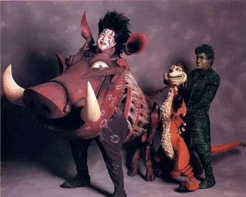 中文版的丁满彭彭照片我没找到,不过看看这个也一样,他们就是这么个造型。彭彭套着山猪壳子,一头冲冠的怒发。丁满也比较辛苦,演员全身绿色从视觉上突出了他身前架着的橙色布偶丁满,可是表演起来,又不能真的让人只注意到布偶丁满,还得关注得到布偶身后的他本尊,表演分寸很难拿捏。