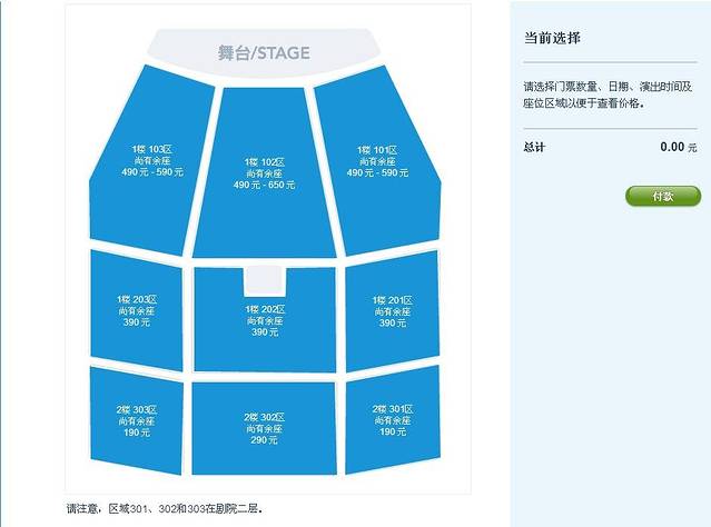 我此次订票前曾首先看过驴妈妈网,发现他们把剧院的座位分为三个区域,楼下前半拉是A区,楼下后半拉是B区,楼上是C区。然后又根据区内位置划分了AA、AB、BA、BB……这样划分下来,你买票的时候根本就不知道自己会得到一个什么样子的座位。而且,官网上101区和103区(驴妈妈上的AB区)实际票价是¥490/张,驴妈妈上是¥510/张,居然还贵了20元。通过这样的代理商订票,既不便宜又不能自己挑选座位,真的不怎么划算。