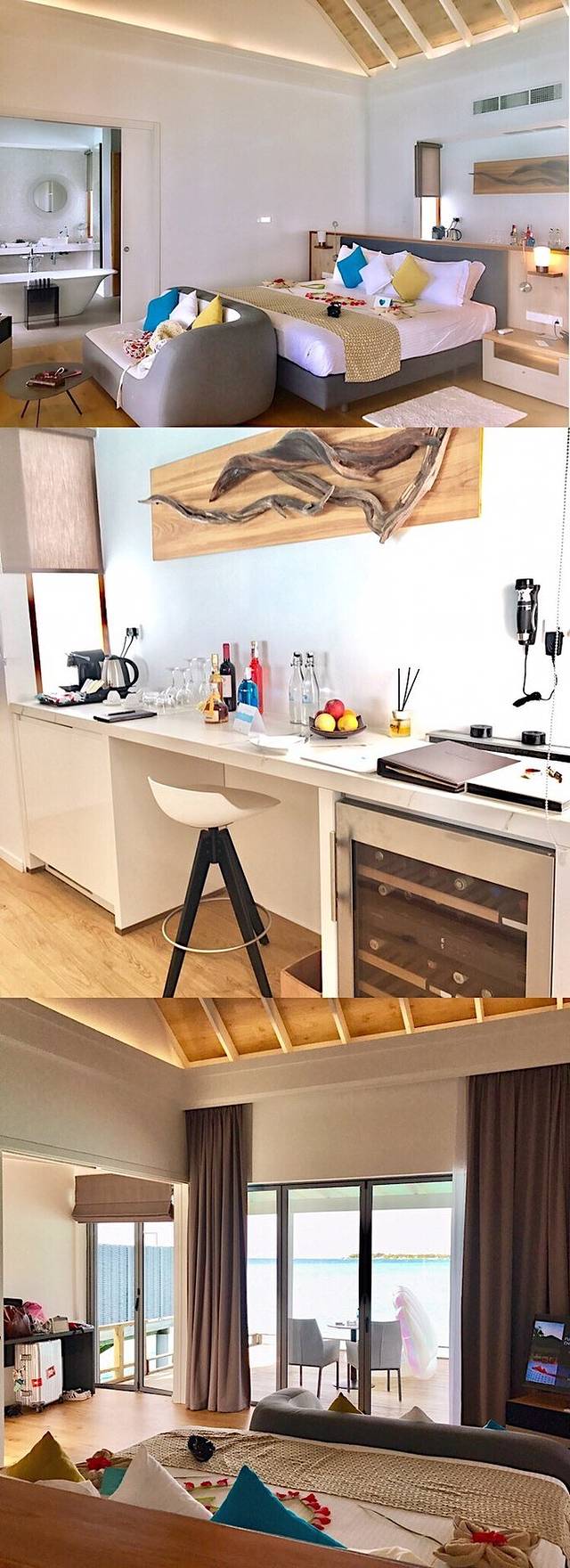 终于到啦,天空和大海,海天一线,真的心情突然格外的放松,感觉接下来的几天真的要好好享受这片水清沙幼的天堂,服务人员给我们发了果汁,和我们讲解了一下上岛的注意事项,介绍了整个岛屿的概况,还有一日三餐,办理了住房手续,坐着观光车到了我们的房间,我们选的是两水两沙,含三餐,房间内的有的东西是付费的,水果可以吃,还有矿泉水,滴漏咖啡和茶,先享受水屋啦,推开房门,被房间的舒适打败,面朝大海的双人床,落地窗,躺椅,浴缸,酒水吧台,还有音乐鲜花熏香,感觉真是享受,和男朋友顿时忘记已经到了午餐时间,就迫不及待想下水感受库拉玛蒂的魅力!