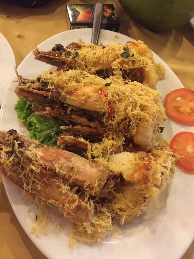 真心感觉一般般,算是这个岛上唯一开发的对外海滩了吧,水上项目也不算太多,沙滩上的沙子虽然很软,但是贝壳类还有些垃圾、树枝什么的特别扎脚,不能像想象中的沙滩漫步、奔跑什么的,这就算了,关键是连下水都是要忍着疼痛举步维艰的走,无奈,我们同行4人,都放弃了,也没见什么人在水里玩,靠近岸边的海水也是浑浊的很,只能穿着鞋子在沙滩上走走,捡了几个海星,挖了些小螃蟹跟螺,之后去了网上久负盛名的真浪花园海鲜,好大的一个店,全满,你千万不要在门口等着有人会来接待你,必须主动去找店员才会有人搭理你,我们4个人在店员的安排下很快就入座了,他们看我们是中国人又安排了一位会中文的来给我们点菜,我们不是很饿,所以就只点了3只老虎虾(奶油),一只肉蟹,一盘炒饭,一份中份姜葱鸡,一份中份空心菜,一共324马币,就老虎虾贵点,3只167马币,折合人民币498,刷的中国银行储蓄卡,扣款506