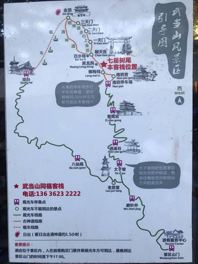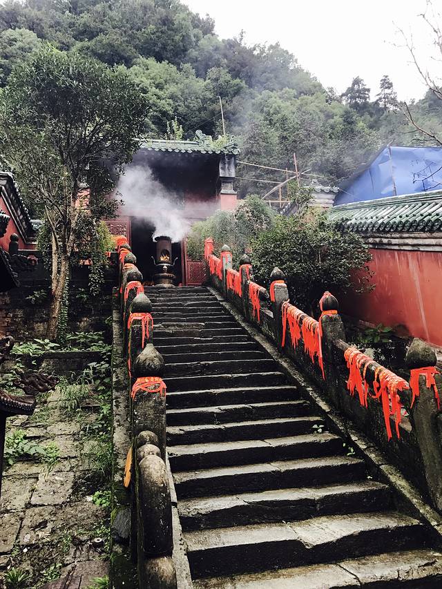 注意事项:景区门票240/人,含景区车。如果在山上住,最适合的线路是先坐车到太子坡,沿逍遥谷、紫霄宫一直到南岩,住一晚,第二天走清神道登顶。到达金顶游览结束后,坐索道或步行下山至琼台游览,后乘坐景区车到太子坡转车至游客中心。南岩附近有很多旅馆住宿,基本200/晚左右。我们住在去金顶路上最后一家旅馆:同福客栈,约在1/4路程处,第二天登顶直接开始爬山。