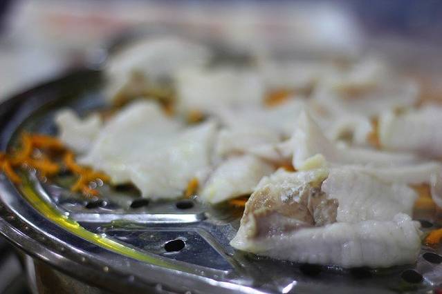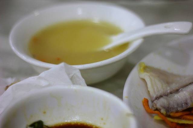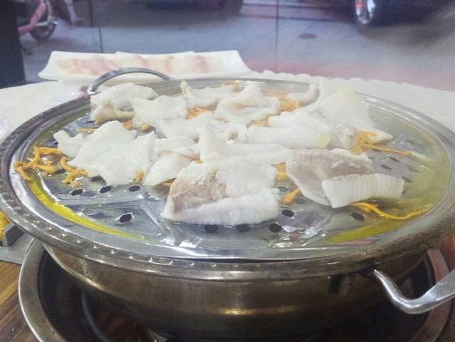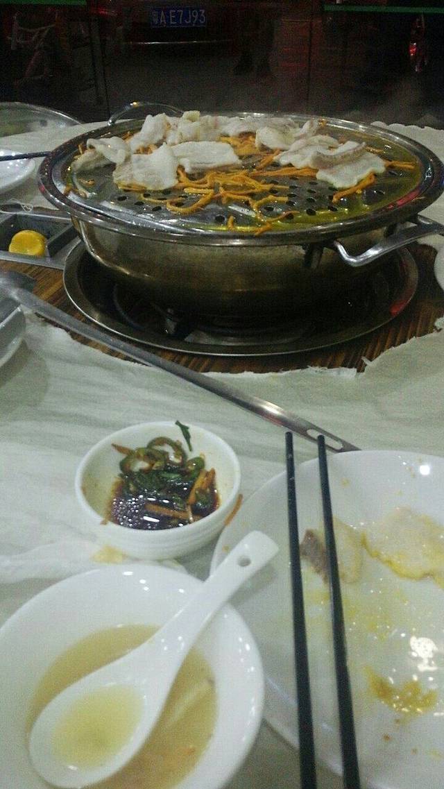 这是全景↓黄黄的是油水,很多哦!一掀锅盖水汽呼呼的,一片片小鱼片全都卷了起来。味道就像是清蒸鱼的味道,但是比它还要新鲜的感觉,师傅手法很好哦,这么六盘子大鱼没吃到一根儿刺er!