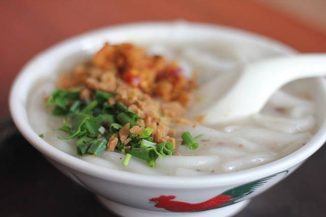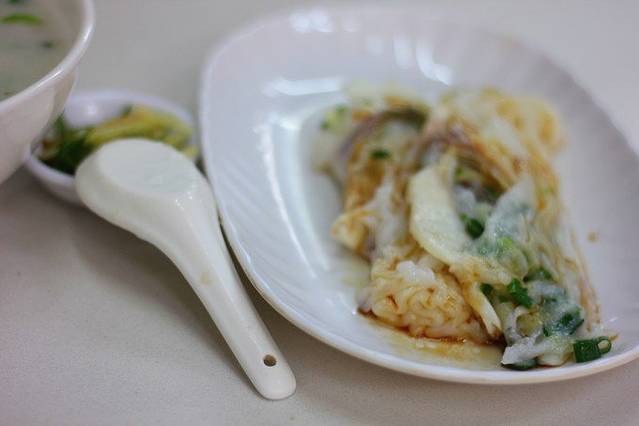 坐下以后,看到好多本地人在吃的早餐店。我们要了及弟粥和鱼片肠粉,做肠粉的大姐给推荐了蛋肉粉。