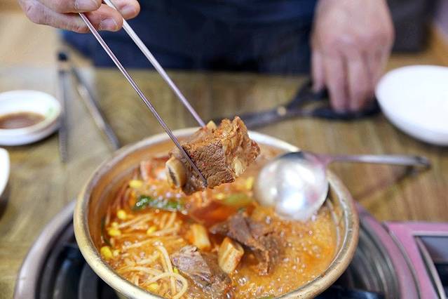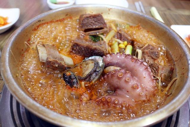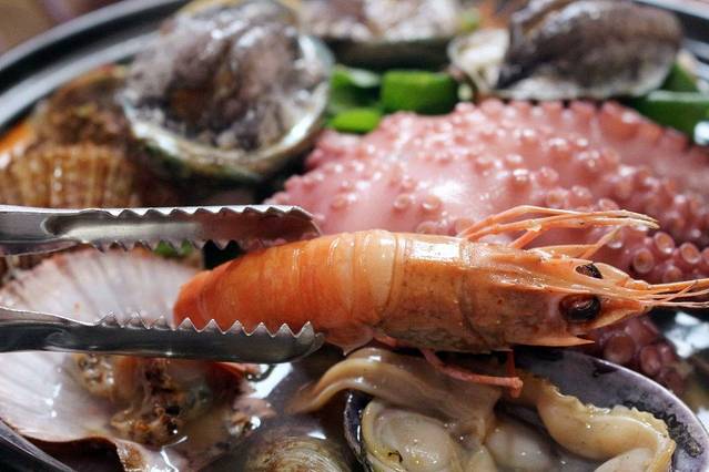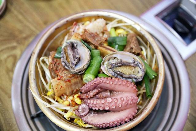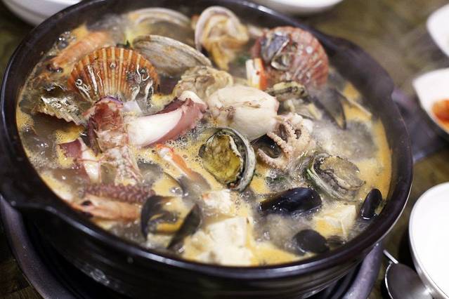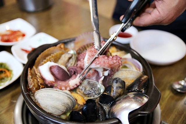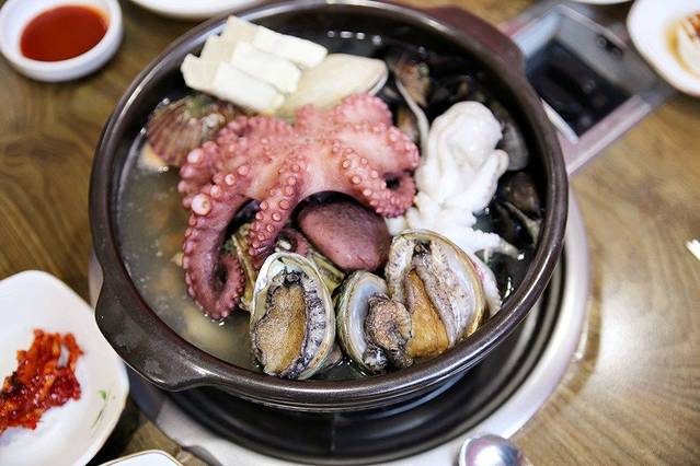 这一大锅混合海鲜,让人口水直流啊!这饱满的蛤蜊肉,沾上韩式特制辣酱,简直是不要太过瘾。
