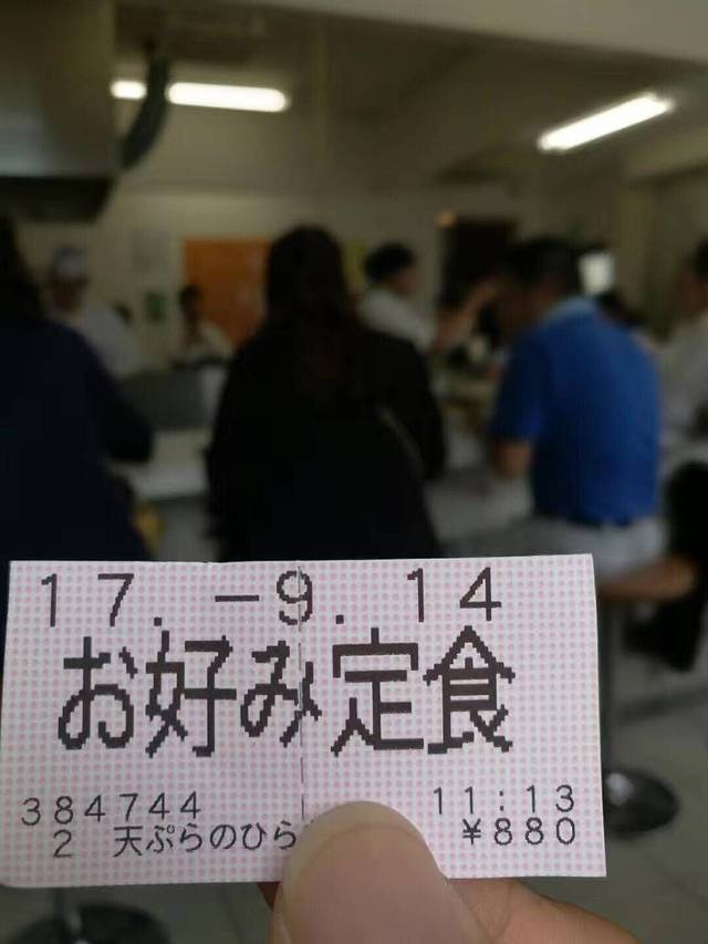 1点左右我们离开香椎宫,准备去一家当地便宜又好吃的天妇罗店天ぷらのひらお,这家店铺看网上介绍基本上中午都是排长队,所以要提前来排队。就是传说中的B级人气美食。实惠量足又好吃。里面的布局有点像回转寿司,食客们坐一圈,厨房在中央。我本来点了一份标准的套餐,怕吃不了,和店铺的小哥说,可不可以米饭少量。小哥特别nice,说少量饭可以便宜30日元,还真的退给了我30日元,让我特别感动。
