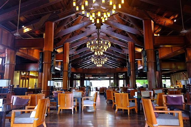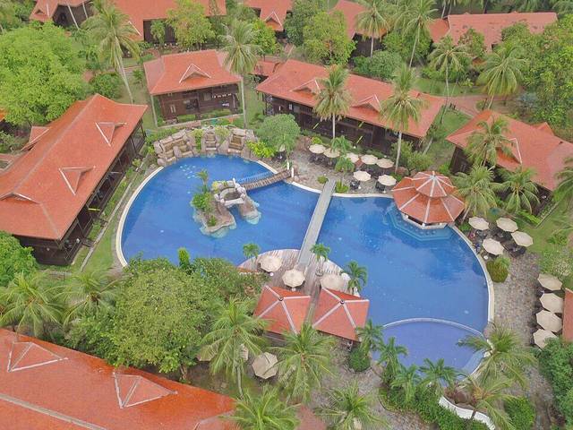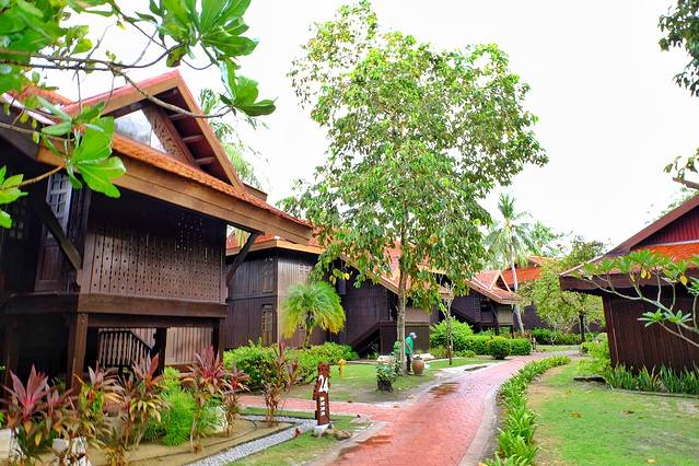 这是一家融合了马来西亚传统村落特色的度假酒店,紧靠绵延一公里长的白沙滩。在郁郁葱葱的热带环境中,坐落着51个独立的小木屋,具有特色的开放式阳台宽敞舒适,配有具有热带风情的斜坡屋顶,暴露屋顶瓦片和桁架,散落在精心设计的花园和沙滩之中。