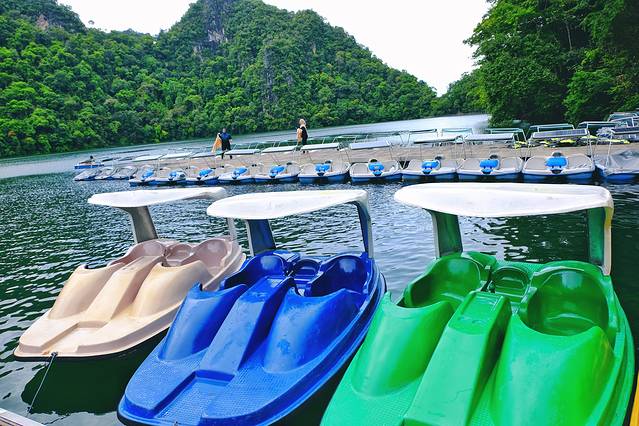 跳岛的路线安排还蛮合理,要抵达的岛都比较相邻,不需要乘坐很久的船。这一站来到孕妇岛,它是兰卡威群岛中最大的一个岛,因为湖边的高山和突出的岩石轮廓就像一位仰卧着的孕妇而得名。孕妇岛上有一片孕妇湖,它的原文意思就是「怀孕的处女之湖」,抵达孕妇湖要穿过一片森林保护区,它是兰卡威最大的淡水湖,可以在里面游泳。但我对淡水湖游泳不太感兴趣,就在岸边等候朋友。看到一些外国友人在这里玩得不亦乐乎,淡水湖旁还有一个被圈起来的小池子,有放养小鱼在里面,免费给游客做鱼疗。