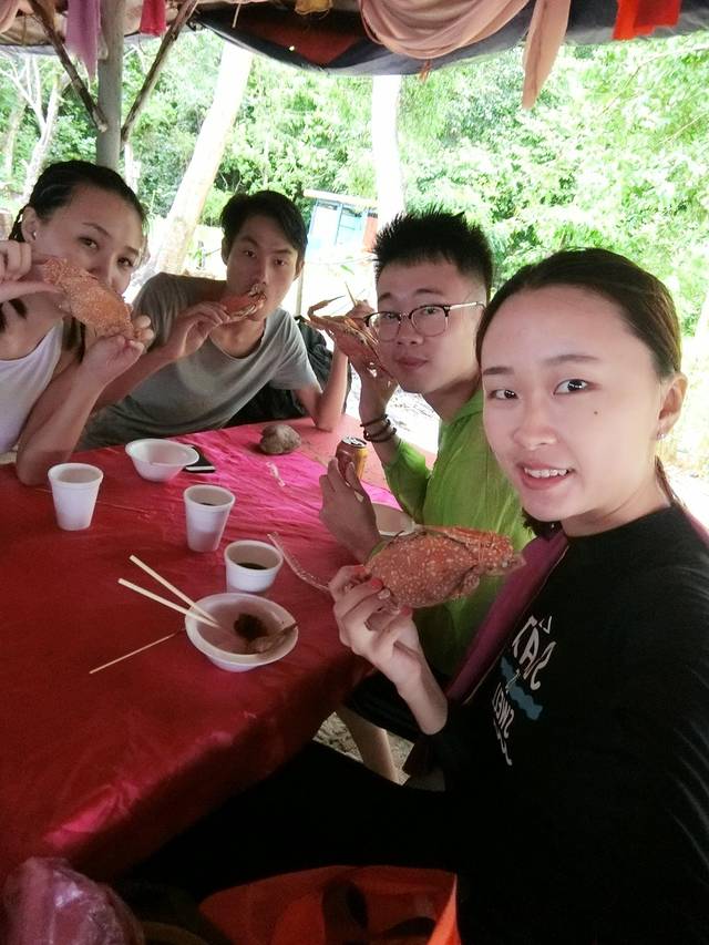 午餐我们到了一座无人岛,厨师们已经等候客人多时,午餐以BBQ 海鲜为主, 还有沙爹肉串,蔬菜,炒米粉和炸鸡翅。沙爹肉串的口感和味道真的超级棒,用炭火烧烤的沙爹肉串越吃越过瘾,有着蜜糖的味道,香气在口,馥郁在心。而且可以吃到饱为止,反正我们吃最多就是这道了。海钓上的鱼,小鱼做成了鱼汤,大鱼用锡纸包着来烤,鱼肉还是挺鲜美的。给这样的团餐点个赞。
