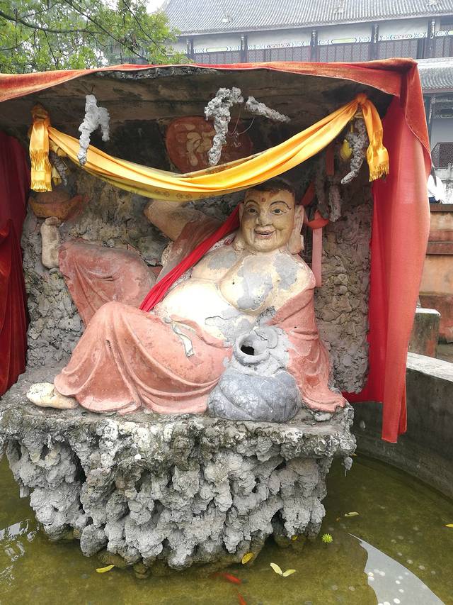 院中大水缸内一侧卧佛,不少游客给佛身投币,你尽管投,他有很大的肚量,但是需要你一点准度。