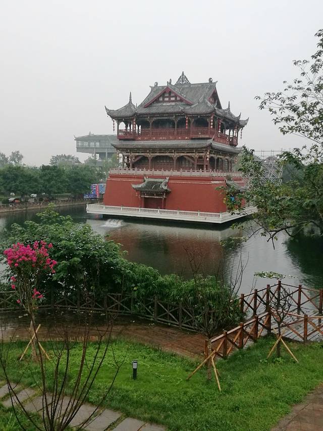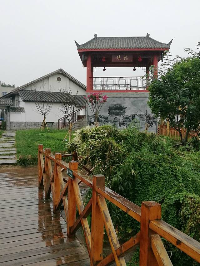 水塘旁的木栈道通往一个绣楼
