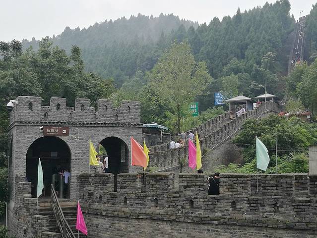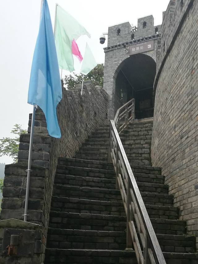 登上长城台阶后回望城门上漂亮的琉璃瓦建筑