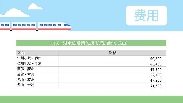 KTX的费用大概在四万韩币到六万韩币之间。请参考下表
