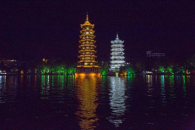 堪称桂林地标性建筑的日月双塔在夜晚的灯光下也比白天漂亮了不少,日月双塔采用的是梯级渐小的阁楼式重塔形式,双塔取日月同辉的之意,看起来珠圆玉润,活脱脱两个大胖小子,日塔在晚上通体金黄的灯光与塔身的黄铜质地相得益彰,而月塔则浑身银亮,将琉璃材质映照得更加透亮华美了,船绕着双塔转圈,日塔和月塔也就忽而变换位置地展现着它们的身姿。小儿子一直抱着我的手左摇右摆,还给我说:“妈妈,我们能不能住进去呀,这两个房子好漂亮哦!!”我一边摸着他的头一边开玩笑地告诉他:“这两个房子可是不能住的,里面住的都是神仙呀。”