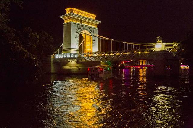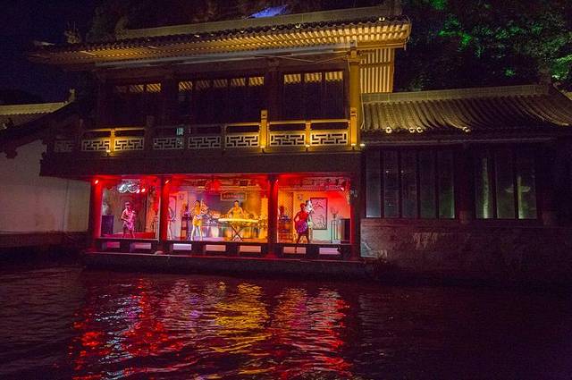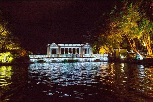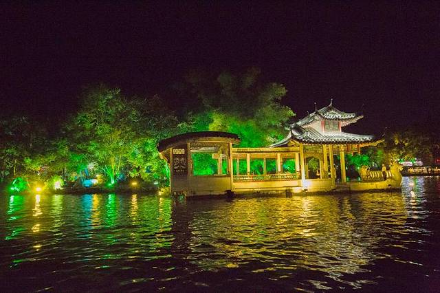 游船穿过玻璃桥来到了榕湖水域,榕湖湖心岛是桂林市民及游客休息纳凉的好去处,从榕湖穿过北斗七星桥就能进入湖心岛,在湖心岛岛上还有茶馆,试想一下,在湖心岛一边喝茶聊天,一边欣赏夜晚迷人的夜色的时光,也称得上是惬意了。