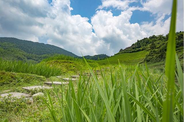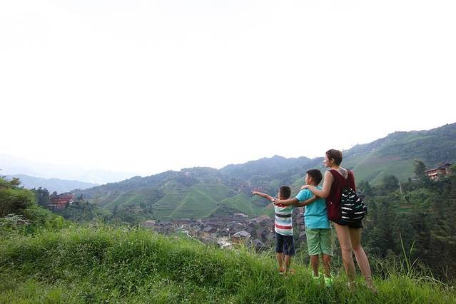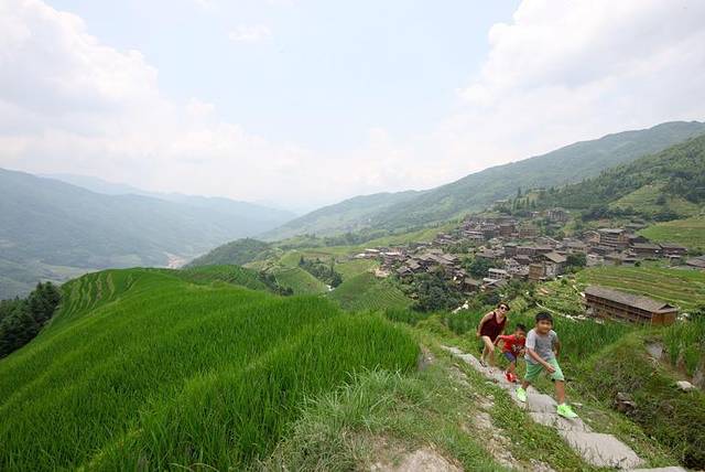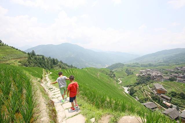 正因为我们今天来得早,所以能够体会到早上自由登山观梯田美景,伴着徐徐的春风,在绿色的海洋之间漫步,呼吸清新的空气,穿越周围像画卷一样美妙的风景,让满载生机的万物温柔我们的视线,心情不禁畅快无比,两个孩子不知道在前面说着什么,一边说一边笑,然后围绕着我和先生,在弯弯曲曲的小道上来回追逐。8月的龙脊,层层梯田都被覆盖上了一层绿色的外衣,这是一片夏天生机傲然的海洋,两个正值少年的孩子,在空旷的天地间,也绽放着无比的生机。