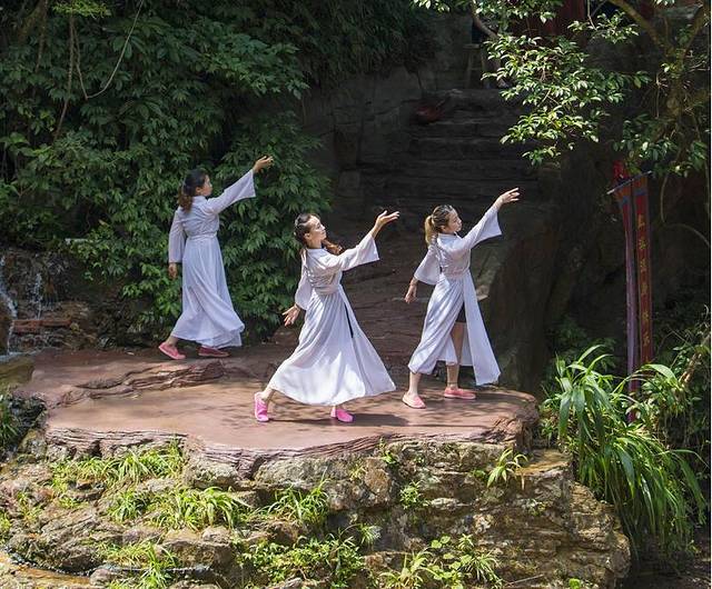红溪景区中的藤条极富特色,四处可见,在溪涧、树石、草木内都有着藤条的身影,故被称作"千藤红溪"。