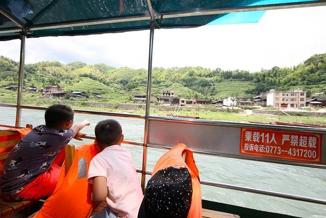 两个孩子又一次坐船,兴致依旧不减昨日。不知道为什么两个孩子这么喜欢水,小儿子还让先生抱着他去摸水,然后开心地把手抹到自己身上,然后又一次重复这个动作,乐此不疲。走到资江边的码头,我们乘船顺流而下,一路看山看水那是最惬意不过的事情了。清澈而灵动的资江象一条玉带在奇山秀岭中蜿蜒千里,又如一首轻松愉快的歌在山间悠扬的歌唱。水流缓急合度,两岸岩石形状不一、大小各异,绿意醉人的树木显得是那样的葱茏,倘徉其中犹如欣赏一幅绝美的山水画卷。
