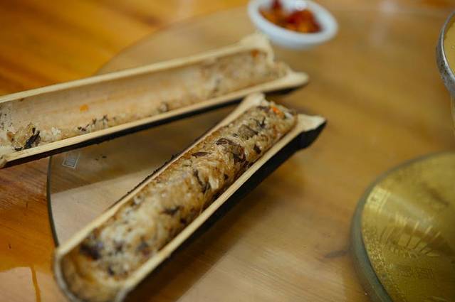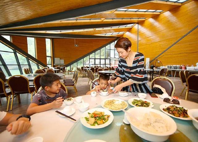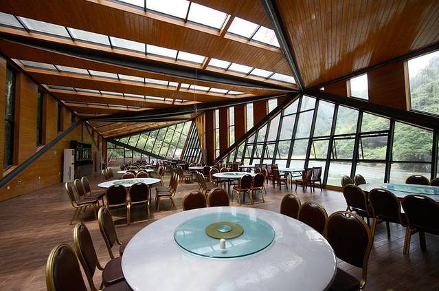 漂流在半小时后结束,在爬山之前我们去了当地的特色餐厅。天门山有临江餐厅,建在资江水边,以若干错综复杂的木梁支撑起屋顶,四周半透明设计,坐在这里就餐的感觉很不一样,从穹顶普照下来的光就洒在我们的餐盘,仿佛恍惚间还能听到资江水流动的响声。就好像我们是坐在水边在吃饭,享受和大自然共存的乐趣。