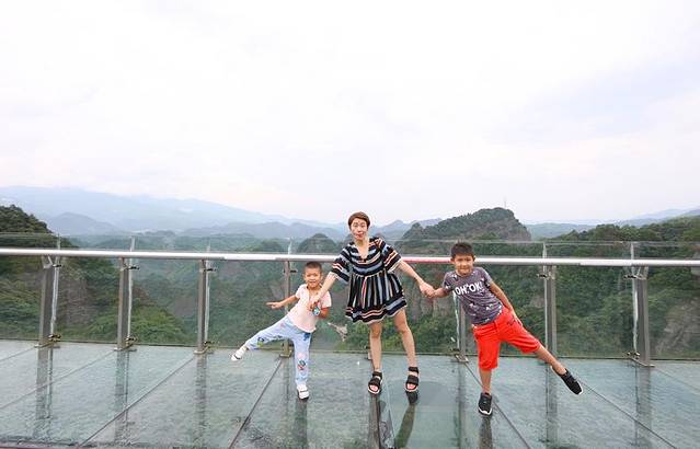 爬山的时候两个孩子依然一直跑在我们前面,蹦啊蹦啊。我仿佛明白了他们的精力和长时间的睡眠不无关系。20分钟的幽谷栈道后,隐约可见“天脊天梯”。天门山的海拔不算太高,只有700多米,但山势还是很陡峭,此时的我有一点气息不稳,先生一边拉着我上山,一边还不忘给我和孩子们照相。再上山十分钟,便到达天脊站的观景台,一览无遗地看着周围壮阔的山峰,真是无限风光在险峰。天门山山顶有条类似鲫鱼背的山脊,沿着这条山脊走可以走到旁边的另一座山峰。山脊上只有一条二三米宽的小道,两侧都是峭壁,好在现在已经修缮了一条有不锈钢护拦的通道,不然带着孩子真的还是心有余悸。