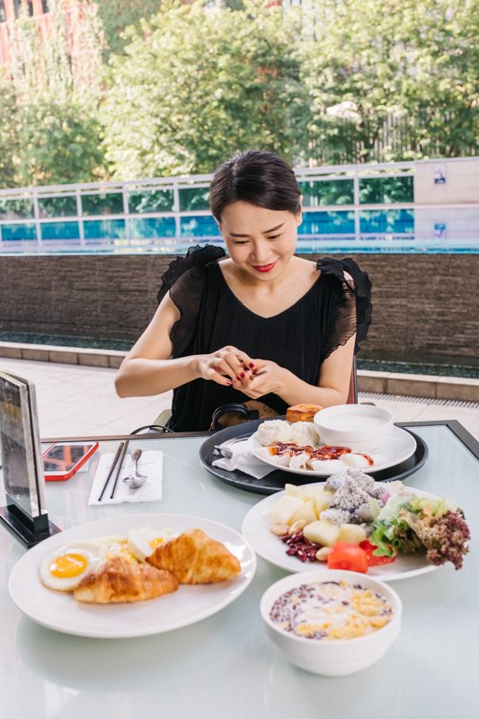 下楼吃早餐去,胡姬酒店的早餐厅就在泳池层。