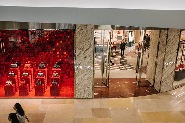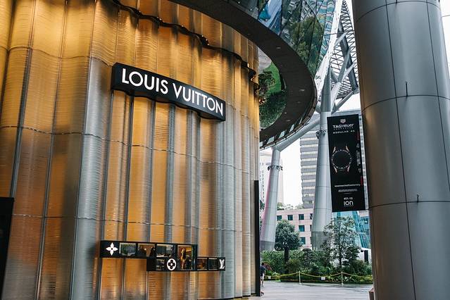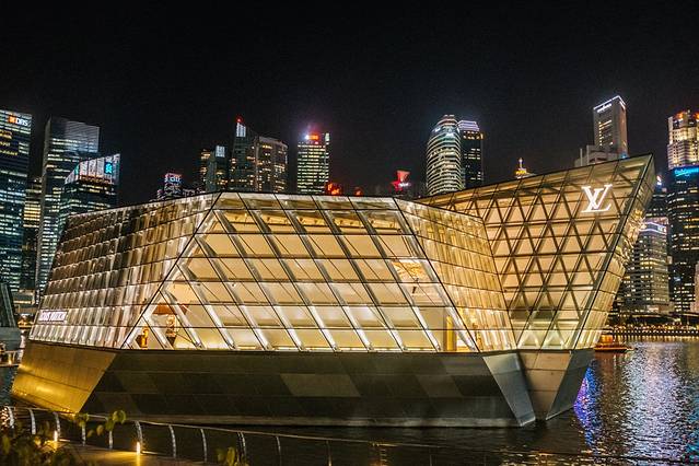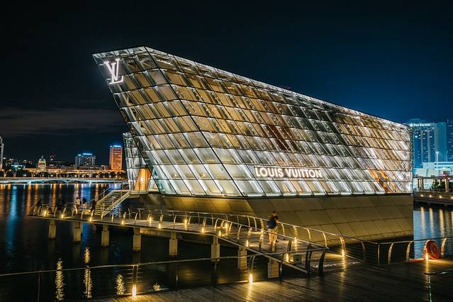 这是LV第一个濒水航海概念的旗舰店,整个外立面犹如一个闪闪发亮的水晶帆船,漂浮在波光粼粼的滨海湾之上。从金沙广场进入店面就好像登上了轮船的甲板。除了这种直接进入的方式之外,也可以从金沙酒店商场的内部进入旗舰店,商场为此设计有专门的地下通道,随后可以搭乘直达电梯来进入店铺内部。