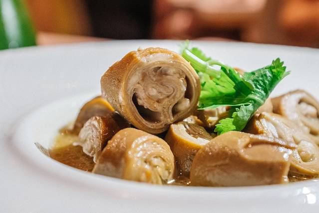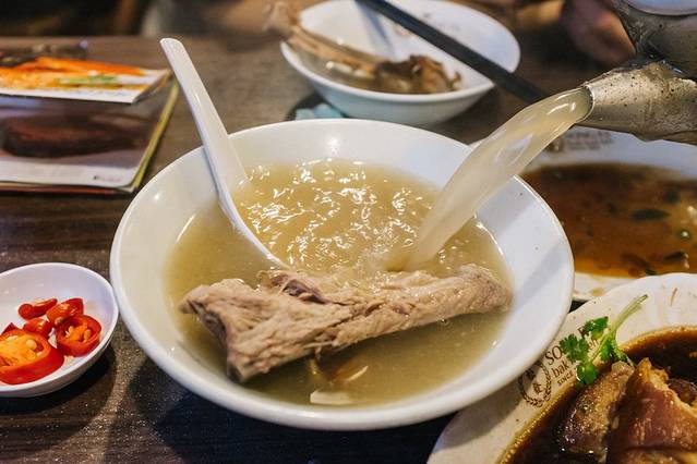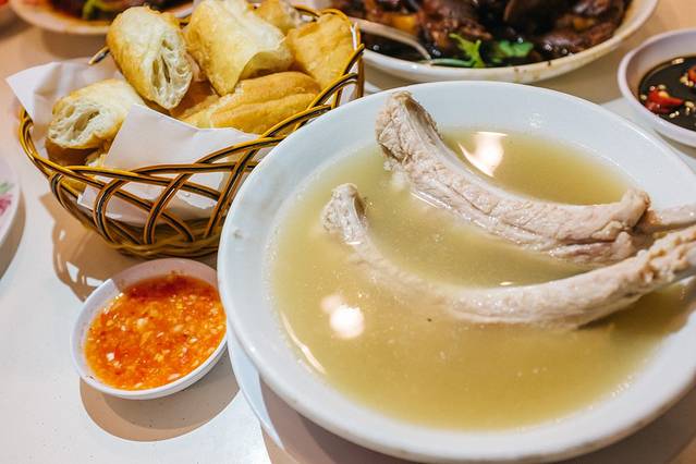 发传人肉骨茶也是潮州派的重胡椒味,汤头的蒜味比起松发稍微清淡点,但药味又更重些。正宗吃法搭配油条蘸着汤吃,浓郁呀浓郁。两碗下肚,回血超快哟~