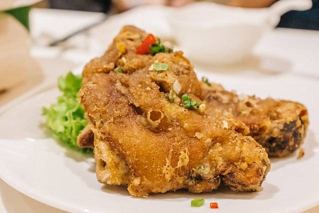 椒盐猪手,应该是先炖煮透彻再椒盐油炸,表层咸香脆口,内里又胶原蛋白满溢~
