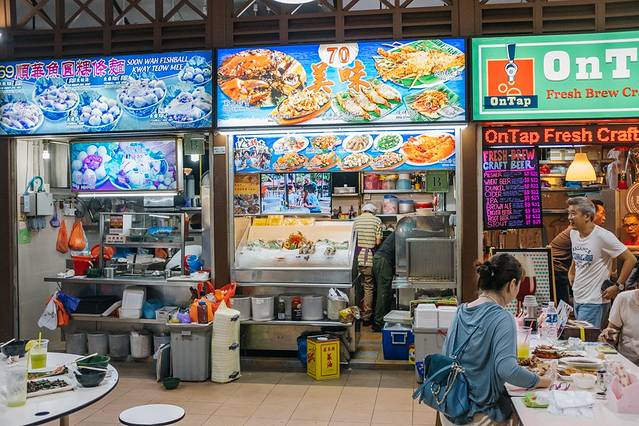 所有的摊位的格局大小都差不多,只是提供不同种类的特色饭菜,包括各种碟头饭、面条、酿豆腐、马来饭、印度咖喱等等,提供大家吃饭用的桌椅等设施也是共用的。而且这里不算restaraunt,那就不用收17个点的坑爹税和服务费啦,标多少价格就收多少。