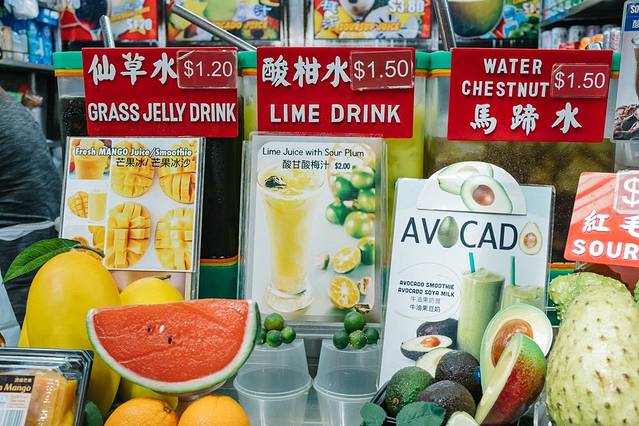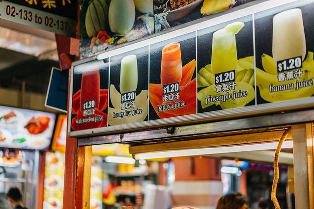 坡国的天气的只有三种:一是hot,二是hotter,三是hottest,在这个常年热死人的地方,所以每个熟食中心都会有专门售卖果汁的摊位,大家吃饭时一般都会喝点饮料,价格也是1-3块不等。