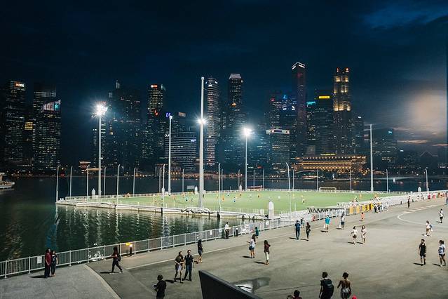 桥上能看到斜对岸的滨海湾浮动足球场,球场漂浮在滨海湾的海面之上,在这里踢场球可真的美死了。