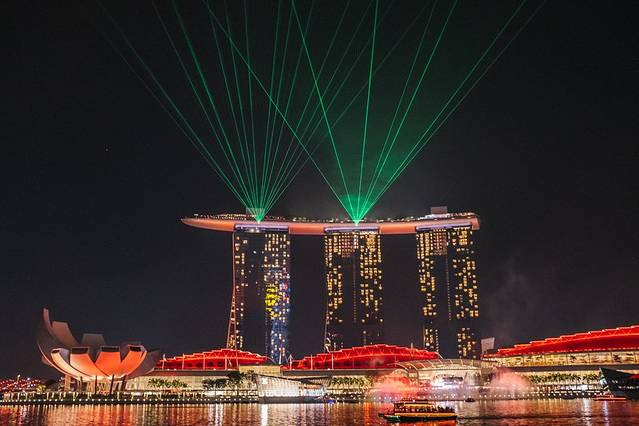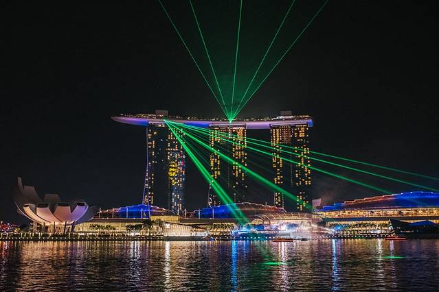 Helix桥一定要晚上来(从这几天的体验来看白天来不是落汤鸡就是晒成狗),桥身闪烁着炫目的红色灯光,美轮美奂。置身其中,仰望星空,感觉很梦幻,仿佛穿越时空隧道一般。桥上还有有五座观景平台,是观看金沙和莲花艺术科学博物馆的绝佳位置。