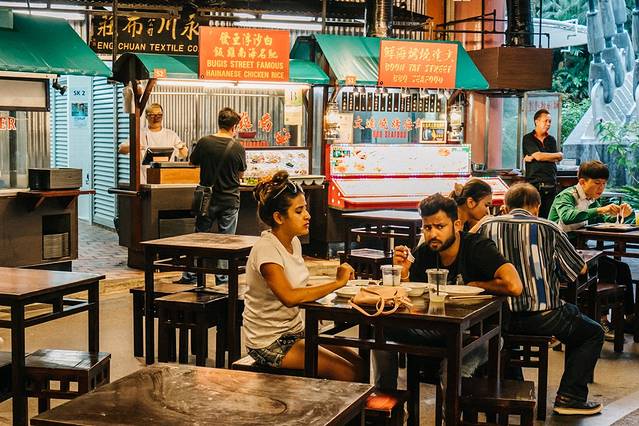 这里也有牛车水美食街,不过都是一些中国口味的菜系,国内都有,我也不信能比国内的做得好吃,价格更是上天,基本是国内的三倍以上。要吃的话还是建议牛车水大厦,记住~2块的香港油鸡饭面