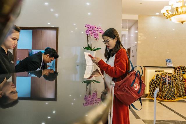 看这前台的妹纸是不是华人拿捏不准~算了我还是说英语算了。