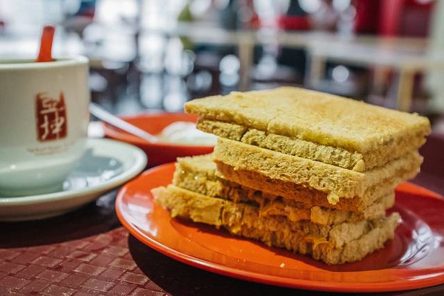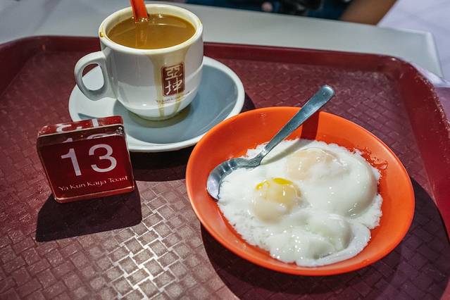 黄油咖椰吐司 + 亚坤咖啡Kopi + 温泉养生蛋,是亚坤传统的组合,就像我们的豆浆油条一样情浓意切。吐司都是即点即烤的,所以会先上一杯咖啡kopi和一碟温泉蛋。