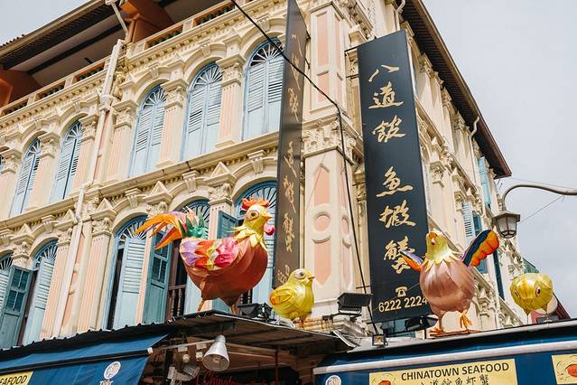 从牛车水地铁站出口位于宝塔街的中段,迎面就看到高挂的红黄灯笼和鸡年春节的华人元素,好像还残余些许春节的氛围。