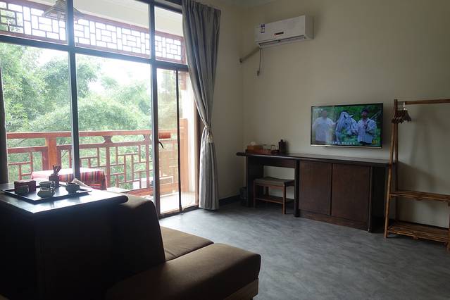 阳朔河岸竹林离西街2公里的路程,酒店直接派车来西街接我们过去,老板娘也非常nice,订的阳台大床房直接给我升级成套房,风景超好的,好开心啊。