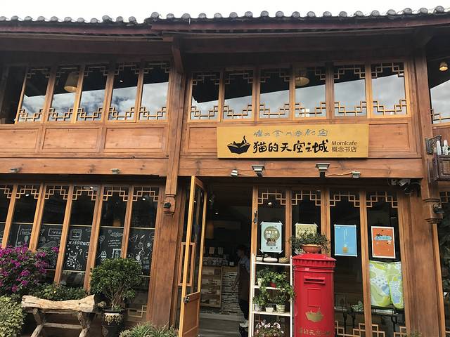 尤其是上午,有的街道竟然见不到一个人,也很安静。中午去88号小吃吃的饭,他们家的鸡豆凉粉不错,去晚了就没了,酸奶也不错,吃饱之后去猫的天空之城,在里面二楼有好多书籍,拿了一本介绍丽江的很老很老的书,临窗而坐,点上一杯喝的,远处的蓝天随意飘荡着几朵白云,阳光温柔的洒在桌上,微风徐徐拂面,文字在指尖跳跃,爱人坐在对面望着自己浅笑,在这一刻我大概明白了丽江的魅力所在,也只有在这样的慢生活中,才会悟出。书店里面还有一小间榻榻米,困的话可以进去小睡一会,这也充分体现了,这就是一个慢节奏的地方,大家都是怎么舒适怎么来。