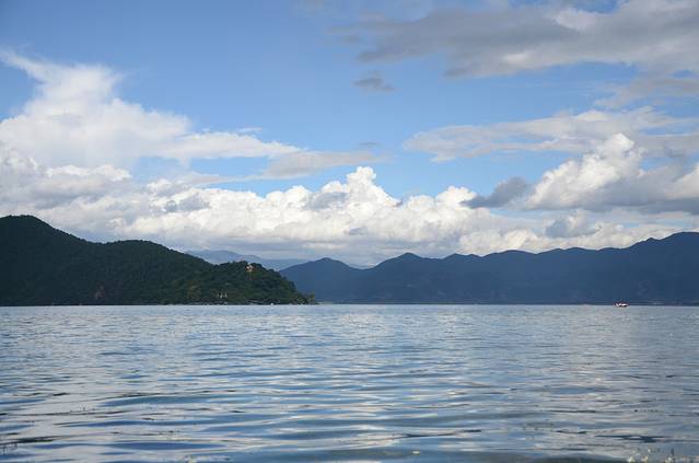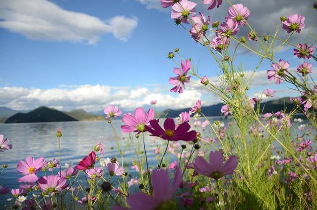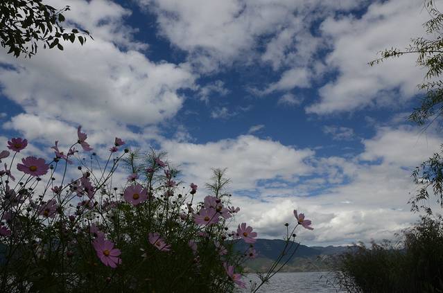 真个地方看一眼就爱上了,那么纯粹,自然。先是坐车到大落水村,下了车之后开始找住的地方。在泸沽湖一般有三个住的到地方,大落水村,垦放,里格岛。第一个属于开发的最早的,后一个是最贵的,中间那个不乏好的住宿,因为那地方适合看日落,我们选择了第一个,主要是方便,走的时候直接提着箱子就走了,不用来回打车什么的,本来想找个临湖的房子,发现太贵了,不过后来的房子也不错,才开没多久,设施都齐全还很干净。住得也很开心,(注意了,此时应该在下车的地方把回历经的票先买了,以防止最后买不到票),吃完饭,东西放好,就开始出去浪了,站在湖边整个人都被惊呆了,说洱海漂亮的人一定没见过泸沽湖,那种蓝看了一眼,就无法忘记,水清澈到看到水底的鱼,水面上随意的飘着花朵(水性杨花的花朵),白云让你已经分不清那块是在天上那块是在水里,随处可见的格桑花,就那样骄傲的长着,让人都嫉妒他们能张在这么好的地方了。原谅我的相机手机都没法排出来我看到的那种美,因为我们出去的时候已经是3点以后了,有点逆光了。