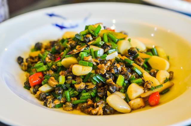这个也行很多人不知道是什么,其实这就是蒜头炒螺蛳肉,非常的开胃尤其是对于喝酒的人而言更是如此的了。