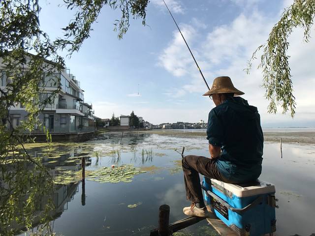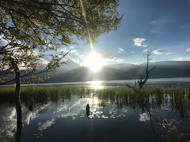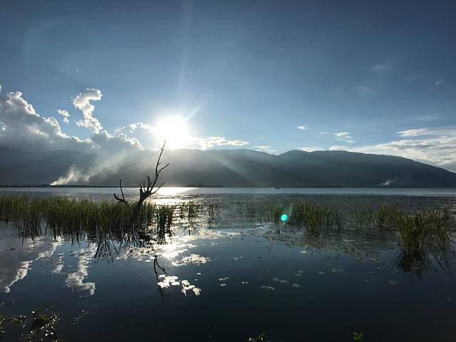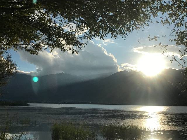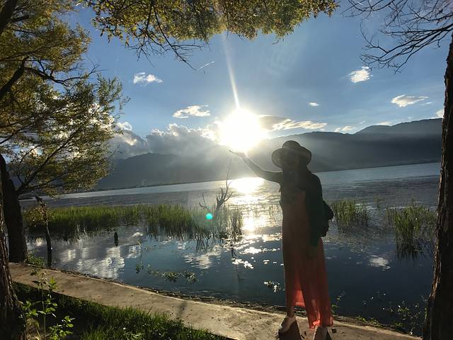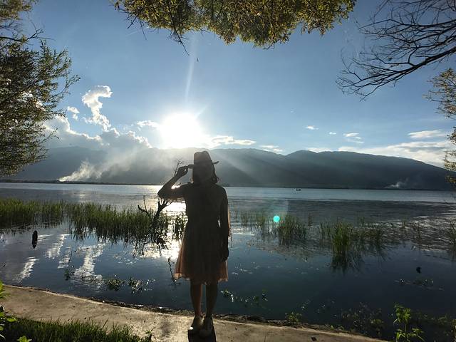 好在鞋子找回的开心弥补了这份桑心,此时也入住了第二家客栈梵七栖客栈,精致的房间,舒适的环境,美丽的天台,两位超级好的暖男老板,瞬间就把这份桑心抛去九霄云外(这里附上酒店点评,第一次写点评,梵七栖绝对值得入住)休息后下午在老板的建议下去了喜洲古镇、海舌公园,一路上所见的景色正如双廊来大理路上所见,很美丽的田园风光,去到海舌公园从舌头的东面环海走到西面(下午游览顺序一定是要这样,因为要看落日呀!)渔船,沼泽,水藻、芦苇、枯树、苍山、云雾、民居、湖面、夕阳,所有元素融成一幅画,只恨没有好的镜头拍下此刻美景,只能用心和眼睛去记忆啦!拍完照赶紧回去大理古城,因为回城时间较晚且走的太远,所以回城漫漫,加上天黑没有路灯,一路小心骑行,还是很惊险的,去程暴晒的要死,回程没有带外套,天黑之后加上骑行,彻底感受了1个多小时的大理风花雪雨四景中“下关风”,寒风中穿裙子短袖骑行,那冷飕飕至今难忘!