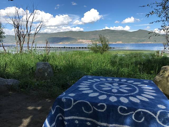 才村沿洱海边很多烧烤小吃档,一个木桌铺上扎染桌布,经典休闲文艺范十足