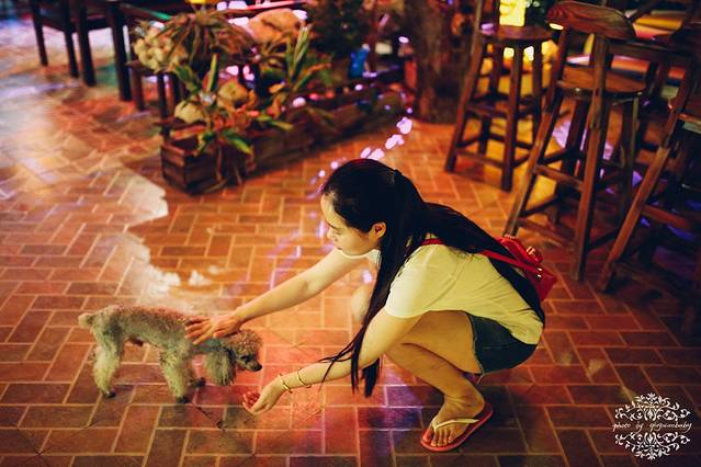 晚饭依旧是在滕海小学旁边的大排档吃鱼排,好吃实惠心满意足。饭后就溜达到小学后面的海边散步。还阔以在海边的酒吧喝一杯。这只酒吧里的狗狗名叫春田。DD逗狗的时候我就喝了一杯大肚杯啤酒。