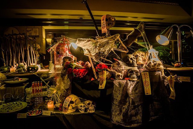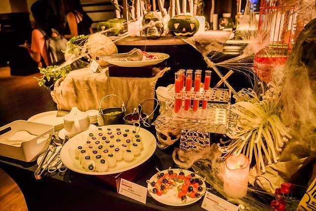 还未体验鬼屋,在晚餐的时候,就先给我们带来一丝恐怖的气氛,平日英伦风格的餐厅,今天变成猛鬼驿站的感觉。无处不在彰显万圣节惊魂夜的恐怖气息。