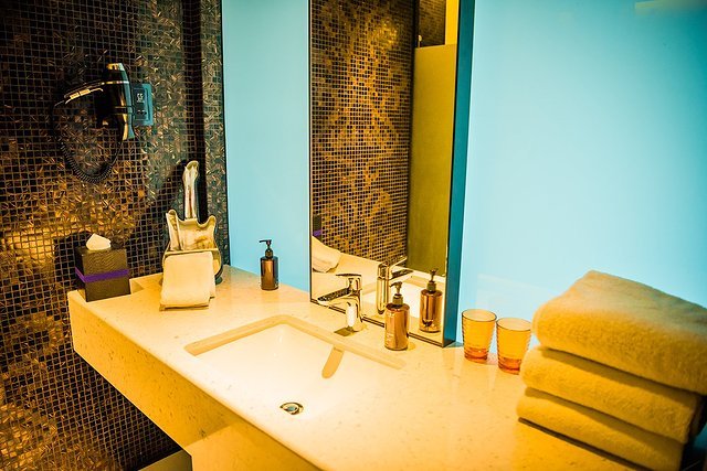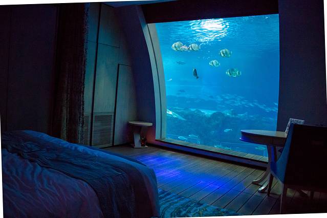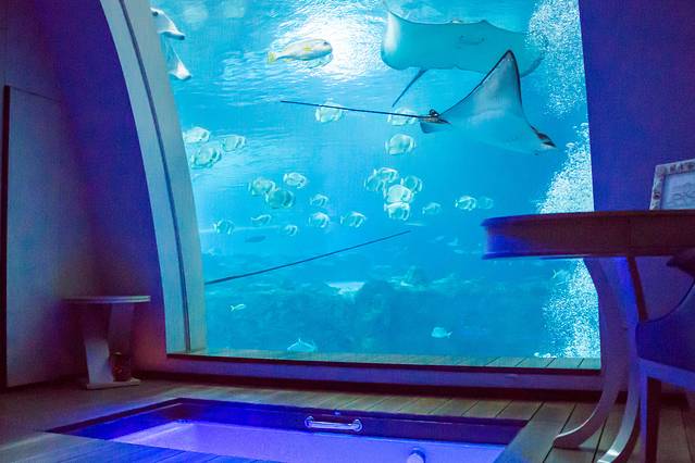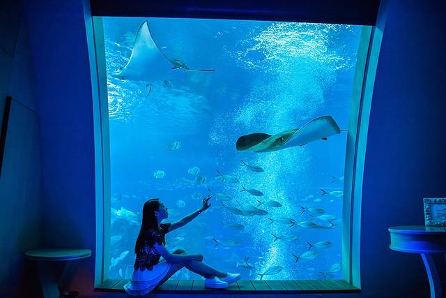 在房间不管是躺在床上,坐在窗边,还是泡在下沉式的浴缸里,都能欣赏到超过五万只,七十种形态各异的海洋生物在水中尽情畅游的美妙奇景。