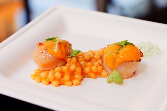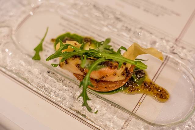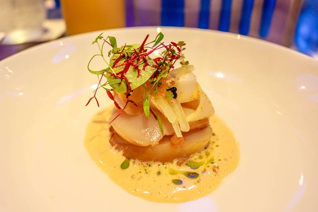 前菜是烟熏北海道扇贝配搭青叻沙酱汁和鱼子酱。精致的摆盘,让人赏心悦目,口感如海洋一般清新自然。