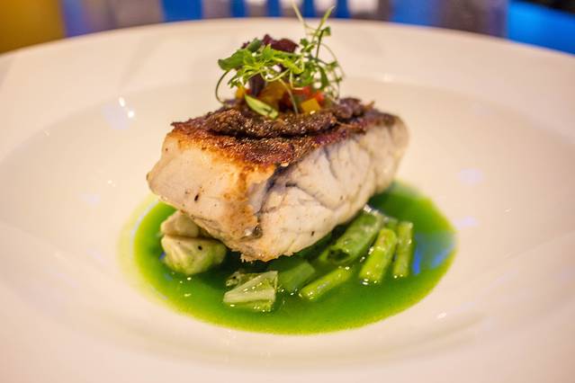 主菜是脆皮野生澳洲鲈鱼,搭配素什锦,味道丰富细腻,且营养健康。