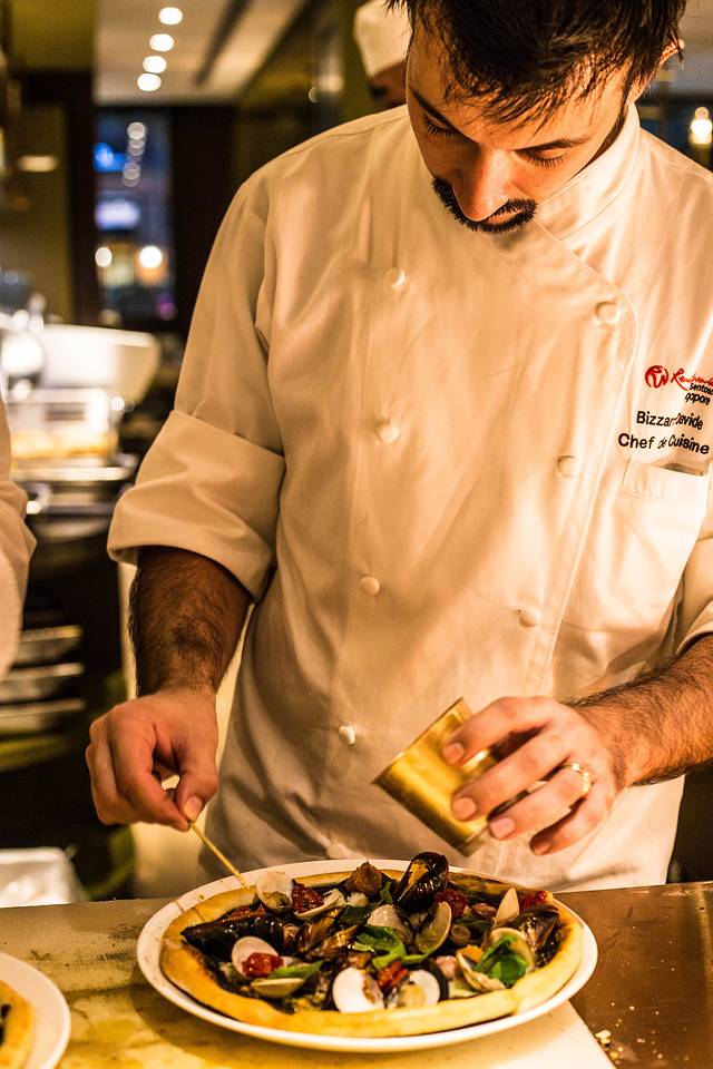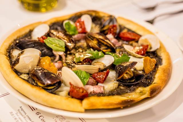 餐厅新晋菜单里的纯手工海鲜披萨,鳕鱼、白蛤蜊、西西里贻贝和鲑鱼籽铺陈,让浓郁的地中海风情充满整间餐厅。